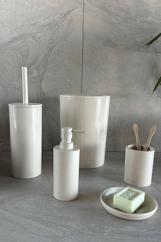 Set of 5 piecesMaterial: PlasticLiquid Soap Dispenser : 6.5 x 18.5 cm / 300 mlSoap Dish: 13 x 2 cmToothBrush Holder: 8 x 10.5 cm Toilet Brush: 10.5 x 33 cm Dustbin: 18.5 x 25.5 cm/ 6 L Color: BeigeMade in Turkey